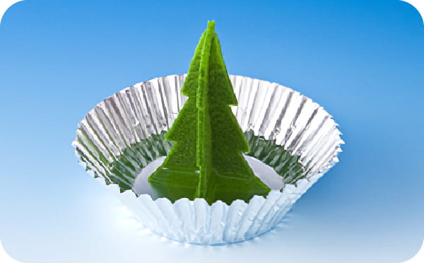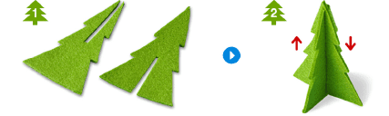 フェルトの布地(ぬのじ)は、洗濯機(せんたくき)で洗(あら)ってかわかしておく。フェルトの布地(ぬのじ)を下のような形(かたち)に切(き)って、2枚(まい)をくみあわせ、ツリーをつくる。ツリーは、アルミニウムカップに入る大きさにしよう。