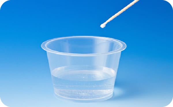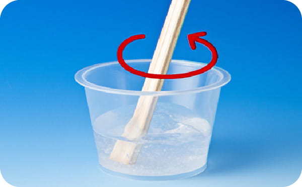 プラスチックのコップにお湯(ゆ)と尿素(にょうそ)を入れて、よく混(ま)ぜる。
