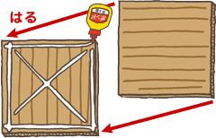 2まいの段(だん)ボールを、「ボンド 木工用(もっこうよう)」ではり合(あ)わせる。段ボールは、たてよこに組(く)み合わせるとしっかりしたフレームになるよ。