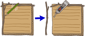 段ボールの上に枝を置(お)き、段ボールと重(かさ)なる部分(ぶぶん)にえんぴつで印(しるし)をつける。そこに「ボンド ウルトラ多用途(たようと)S・Uクリヤー」をつけ、枝を置いてくっつけよう。