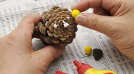 松(まつ)ぼっくりでフクロウをつくろう。紙(かみ)ねんどで目やくちばしをつくったら、「ボンド 木工用(もっこうよう)」で松ぼっくりに少(すこ)しおしこむようにしてつける。