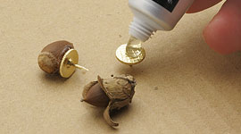 画(が)びょうに、どんぐりや余(あま)った木の枝(えだ)を「ボンド ウルトラ多用途(たようと)S・Uクリヤー」でつける。