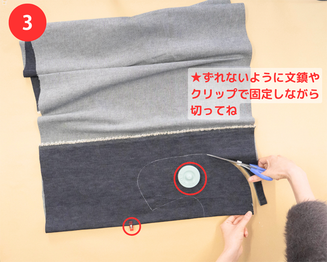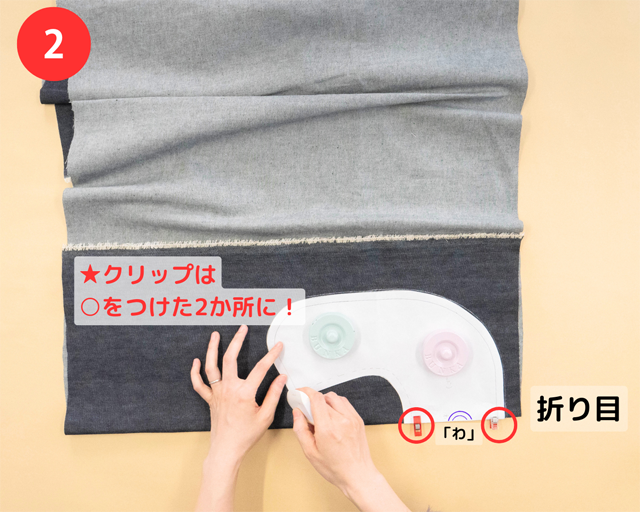 クリップや文鎮で型紙を固定すると、ずれにくくなるよ。クリップをつける位置(いち)は、写真(しゃしん)でかくにんしてね!