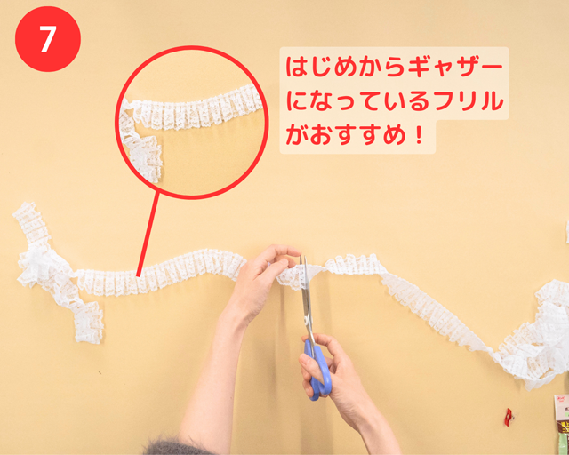 フリルを108cm測って切る。