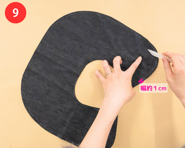布がさめたら、接着した部分(布の外がわ)に5mmほどの長さの切り込みを入れていく。