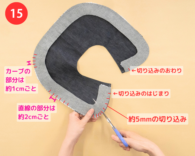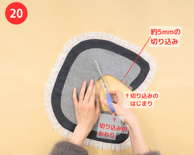 切り込みをいれると、㉒で首の部分をつくるときに、きれいなカーブをつくれるよ!