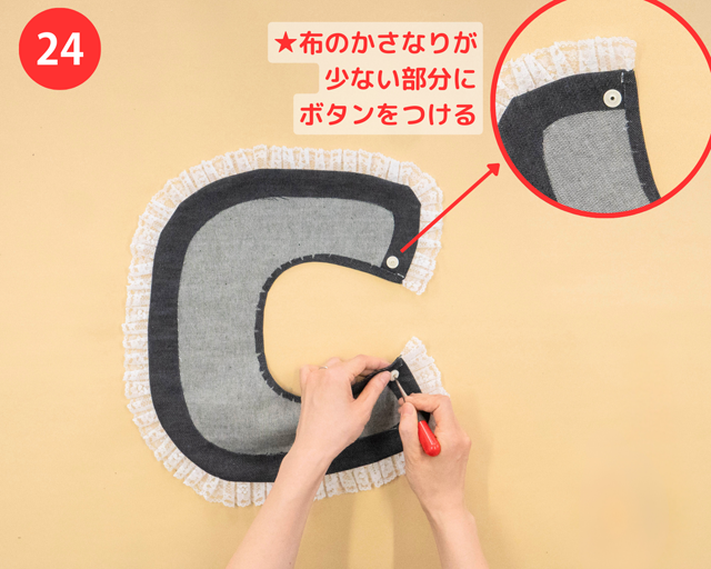 布が冷めたら、布がかさなった部分(あつみのある部分)をさけて、目打ちやハサミでスナップボタン用の穴をあけ、ボタンをつけたら完成!