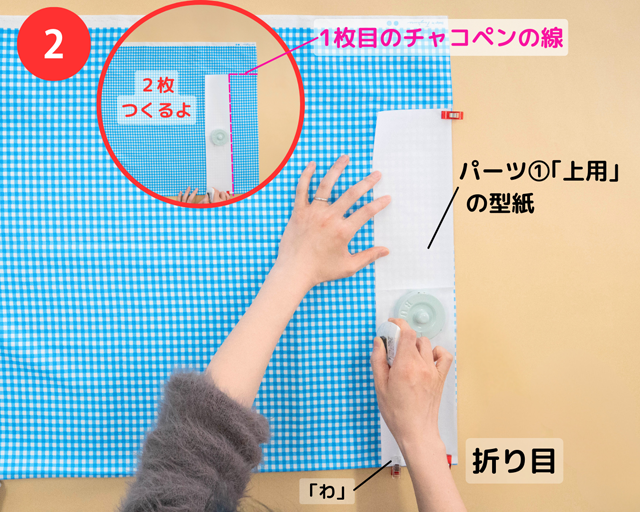 布A(上用)を2つに折(お)った 折り目と、パーツ①「上用」の型紙の「わ」の部分をそろえて固定(こてい)し、チャコペンで型紙をなぞっていく。