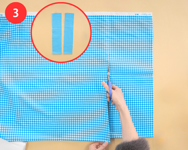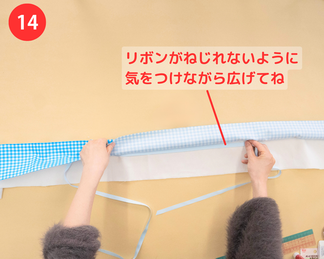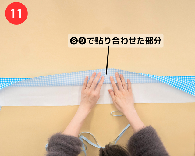 ❿で貼り合わせた部分にそわせるように、リボンを布の端まで広げる。