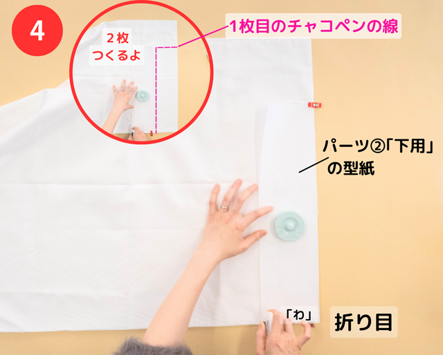 同じように、布B(下用)を2つに折(お)った 折り目と、パーツ②「下用」の型紙の「わ」の部分をそろえて固定(こてい)し、チャコペンで型紙をなぞっていく。