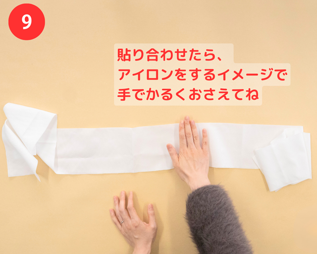 「裁ほう上手 スティック」で貼り合わせた後は、手でアイロンをするイメージで、上からかるく おさえてね