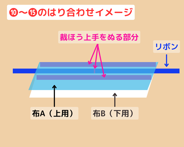 ❿~⓯は、布A(上用)・布B(下用)・リボンを貼り合わせていくよ。
