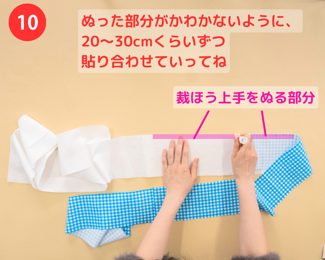 ★一気にぬると「裁ほう上手 スティック」が、かわいてしまうので、20~30cmくらいずつ貼り合わせてね