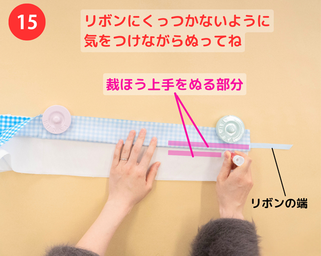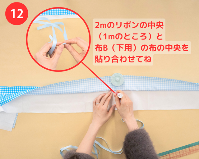 ❿で貼り合わせたすぐ下の部分に、布とリボンを固定するために、布B(下用)の中央部分と、2mのリボンの中央部分(1mのところ)に「裁ほう上手 スティック」をそれぞれぬり、貼り合わせる。