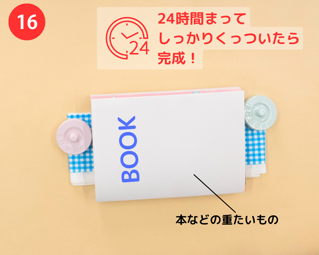 端から端まで貼り合わせたら、折りたたんでテーブルなどの平らな所におき、上に本など重たいものをのせて、【24時間】まったら完成(かんせい)!