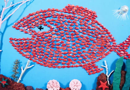 スイミーや仲間(なかま)の小魚(こざかな)たちを、カボチャの種子(しゅし)でつくったアイデアが、斬新(ざんしん)でとてもおもしろいですね!