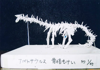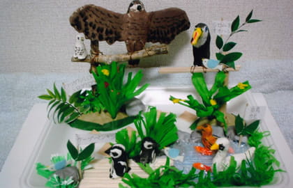 カレンダーや、空箱(あきばこ)を利用(りよう)したエコな作品(さくひん)で、しかも、折(お)り紙(がみ)の鶴(つる)を変形(へんけい)させて骨(ほね)の部分(ぶぶん)をつくるというアイデアが、おもしろい作品(さくひん)ですね!