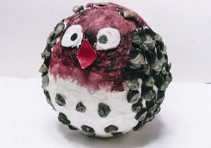 風船(ふうせん)を利用(りよう)してつくったり、穴(あな)を吹(ふ)くと音(おと)が鳴(な)ったり、つつくと起(お)き上がったりと、工夫(くふう)がたくさんあるたのしい作品(さくひん)ですね!