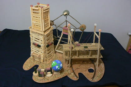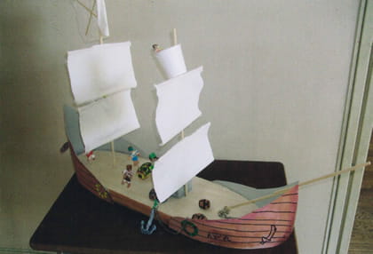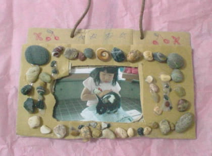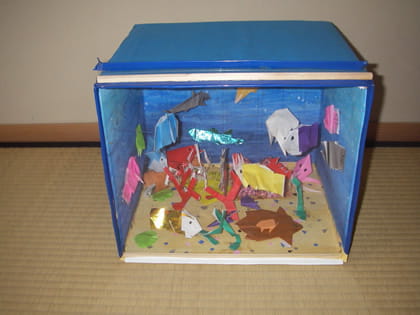 ダンボールをくりぬいた形(かたち)がおもしろく、また大小さまざまな石(いし)や貝(かい)が、ちりばめられたにぎやかな作品(さくひん)ですね!
