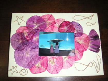 あさがおの押(お)し花で、魚(さかな)の形(かたち)をつくるアイデアがおもしろい作品(さくひん)ですね!