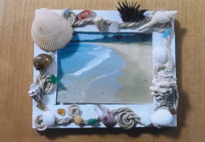 本当(ほんとう)の海(うみ)で拾(ひろ)ってきた貝(かい)やウニが、大自然(だいしぜん)を連想(れんそう)させる、おもい出いっぱいのフォトフレームですね!