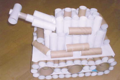 トイレットペーパーやラップの芯(しん)でカッコイイ戦車(せんしゃ)ができていますね!アイデアが最高(さいこう)です!