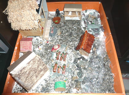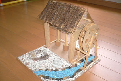 わらぶき屋根(やね)や地面(じめん)に砂(すな)や石(いし)などを接着(せっちゃく)してあり、本物志向(ほんものしこう)の作品(さくひん)ですね!