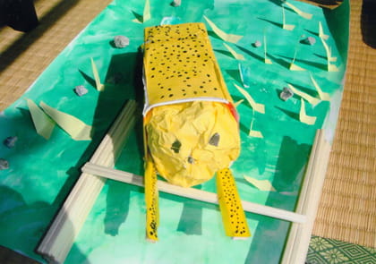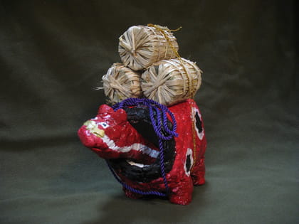 頭部(とうぶ)の振り子構造(ふりここうぞう)や背中(せなか)の米俵(こめだわら)など、細部(さいぶ)までていねいにつくられた、とてもすてきな作品(さくひん)ですね!タイトルにこめられた気持(きも)ちが伝(つた)わってきます!