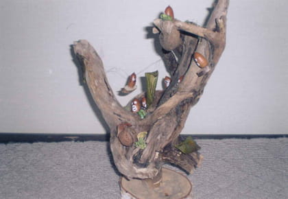 木の風合い(ふうあい)を生(い)かしたすてきな作品(さくひん)ですね!ブランコやロープウェイなど、どんぐりが自由(じゆう)に動(うご)く部分(ぶぶん)もつくってあるのが、たのしいですね!