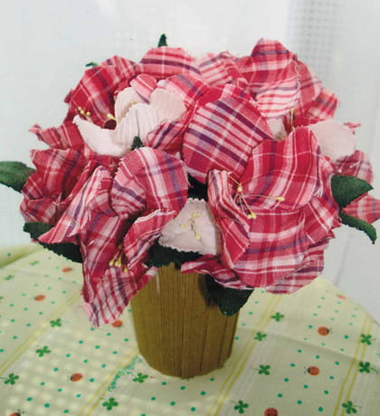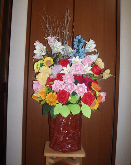 おりがみとはおもえない、本物(ほんもの)のお花(はな)にまちがえてしまいそうなほどの完成度(かんせいど)ですね!かごを広告(こうこく)のチラシで編(あ)んでつくってあるのも、おどろきです!