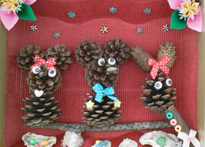 松(まつ)ぼっくりやどんぐりなど、自然(しぜん)にあるものをつかって、りすやふくろうなど森(もり)の住人(じゅうにん)がとてもかわいくできましたね!