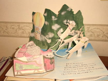 紙(かみ)だけでなく、綿(めん)やひもなどいろいろな素材(そざい)を使用(しよう)し、とび出す絵本(えほん)の立体感(りったいかん)がよりでていますね!どんなお話(はなし)なのか読(よ)んでみたいです!