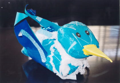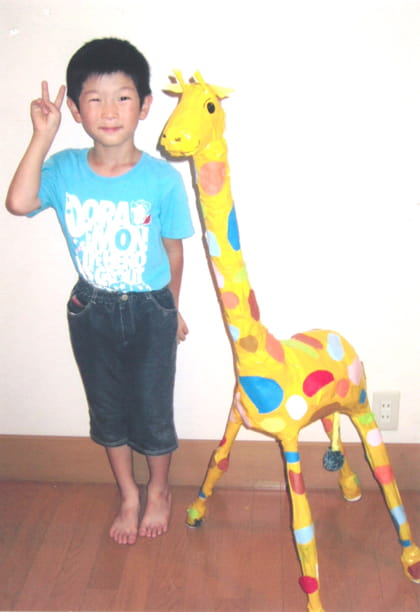 大きなキリンができましたね!色(いろ)づかいもカラフルでとてもきれいです。わりばしやラップの芯(しん)、新聞紙(しんぶんし)でつくったとはおもえない作品(さくひん)です。