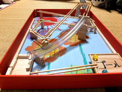 ビー玉(だま)の通り道(とおりみち)のしかけにも工夫(くふう)があふれる作品(さくひん)で、見るだけでなく、遊(あそ)んでもたのしそうです。