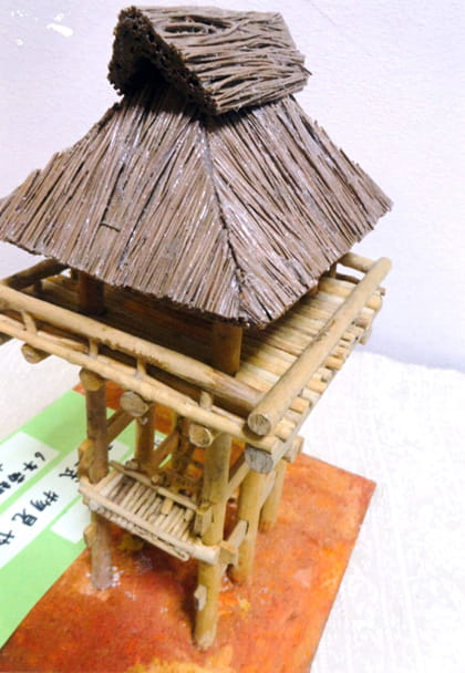 枝(えだ)を1本1本接着(せっちゃく)してつくった屋根(やね)は大人(おとな)顔負(かおま)けのできです。そのほかの部分(ぶぶん)も実物(じつぶつ)に近(ちか)づけるための工夫(くふう)があふれていますね!