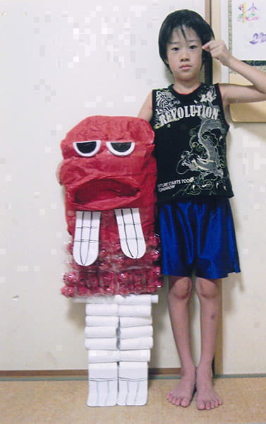 大きな作品(さくひん)を、がんばってつくりました。お腹(なか)に卵(たまご)のパック、足にトイレットペーパーの芯(しん)をつかうことで、おもしろい質感(しつかん)が出ています。私(わたし)も、ピグモン大好(だいす)きでしたよ!