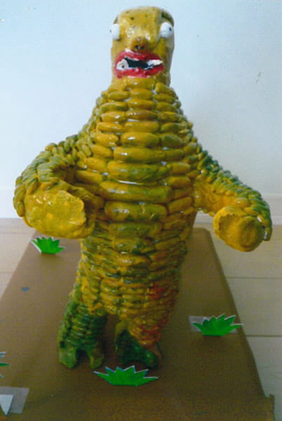 表情(ひょうじょう)が、ユーモラスで魅力的(みりょくてき)ですね。体(からだ)の表面(ひょうめん)に紙(かみ)ねんどを工夫(くふう)してつけることで、皮膚(ひふ)のボコボコした感(かん)じが上手(じょうず)に表現(ひょうげん)できています。