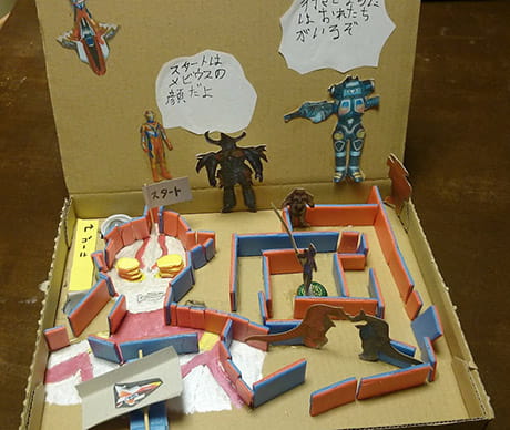 ウルトラマンの体(からだ)を迷路(めいろ)にするというアイデアが、おもしろいですね。また、いろいろな怪獣(かいじゅう)を登場(とうじょう)させることで、ストーリーをつくりながら遊(あそ)ぶことができそうです。おもちゃとしても大変(たいへん)よい作品(さくひん)です。