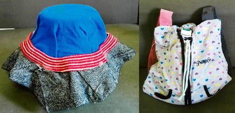 ぼうしもリュックもよくできてます。リュックはデザインだけでなく、機能性(きのうせい)も考(かんが)えてつくってありますね。ぼうしはまわりをぬうのはむずかしいところを、ボンドで見事(みごと)に丸(まる)くつなげ、ひだの部分(ぶぶん)もうまくつくれてます。