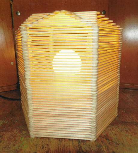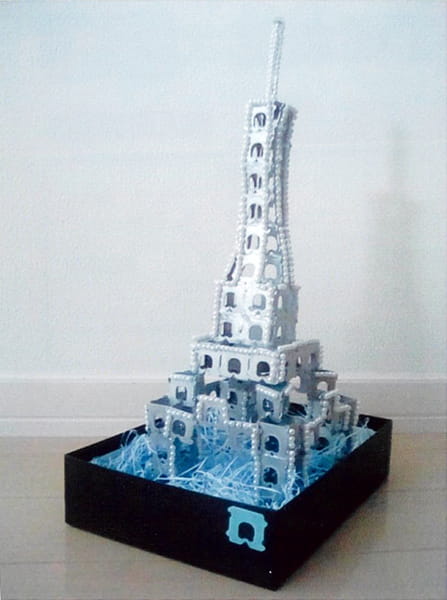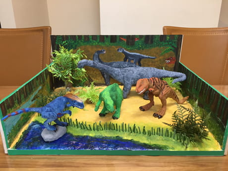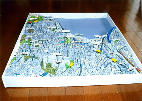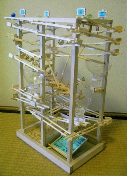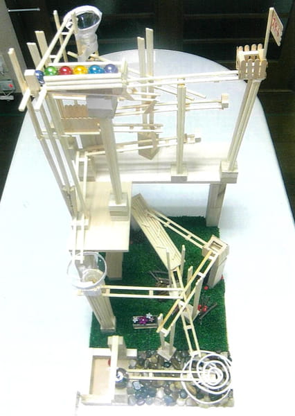 これはよくできてますね。こまかいところもボンドをつかってきれいにくみあわせています。おもちゃ屋(や)さんで売(う)っているくらいの完成度(かんせいど)の高(たか)さですね。わりばしと木とペットボトルという、どこにでもある材料(ざいりょう)でよくつくりきりました。公園(こうえん)に見立ててベンチを置(お)いたりこまかいところまでていねいにつくりこんでいるところも感心(かんしん)しました。