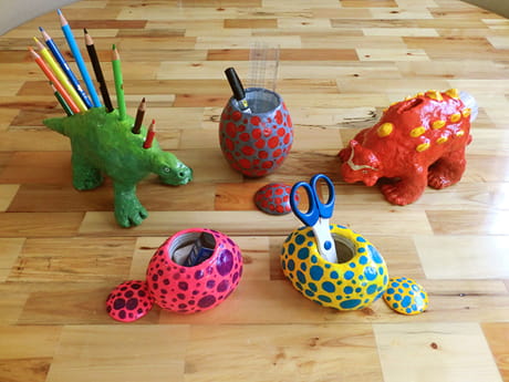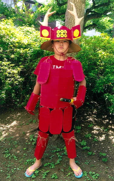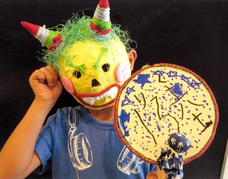 風船(ふうせん)に和紙(わし)をはってつくったという鬼(おに)の表情(ひょうじょう)がいいですね。子どもだからこそつくれるすばらしさがあるとおもいます。かみの毛(け)や角(つの)など、意外(いがい)とはりにくくて苦労(くろう)したんじゃないかな。よくがんばったとおもいます。努力賞(どりょくしょう)ものですね。