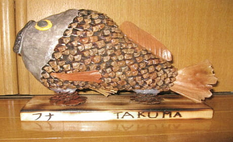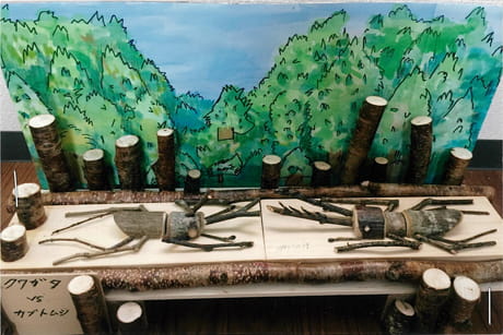 材料(ざいりょう)に札幌(さっぽろ)ならではのシラカバをつかっているところに好感(こうかん)を持(も)ちました。作品(さくひん)にもあっているし、オリジナリティも出ますし、うまい材料(ざいりょう)選(えら)びをしているなとおもいます。クワガタムシもカブトムシも大きくて迫力(はくりょく)もありますね。ぜひガラスケースなどに入れて大事(だいじ)にかざってあげてほしいですね。