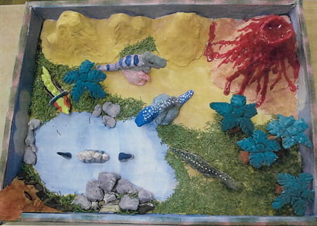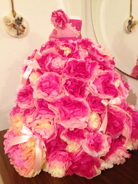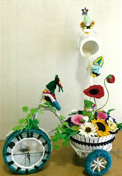 フェルトでフラワーアートに挑戦(ちょうせん)した作品(さくひん)です。妖精(ようせい)のお人形(にんぎょう)や花鉢(はなばち)、時計(とけい)などすべてひとつひとつにこだわりがあって、見ていてあきない工夫(くふう)がすばらしいですね。きっと材料(ざいりょう)選(えら)びからがんばったんだろうなとおもいます。デザインもすてきで、高学年(こうがくねん)の女の子らしい夢(ゆめ)のある作品(さくひん)になりましたね。