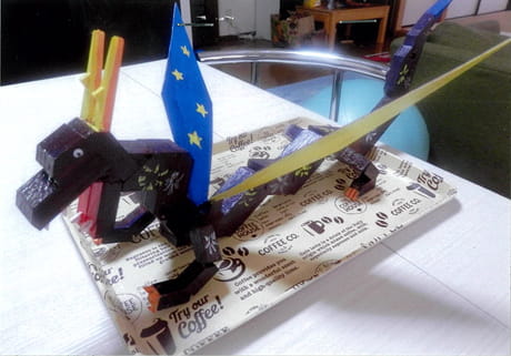 これはもうアート作品(さくひん)と言(い)ってもいいでしょう。プラスチックのダンボールにセロハンをはってつくったそうで、これ自体(じたい)がステンドグラスですよね。ぜひじぶんの勉強机(べんきょうづくえ)のまえにはっておいてたのしんでもらいたいですね。デザインもアイデアも見事(みごと)でした。