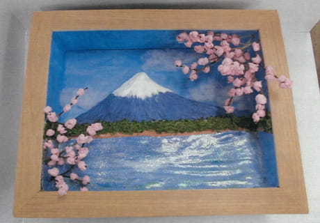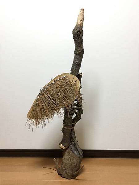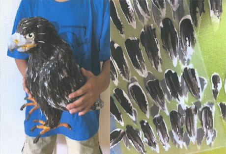 今(いま)にも動(うご)き出しそうな、とても強(つよ)そうで見事(みごと)なイヌワシです。とくに感心(かんしん)したのが、ボンド 木工用(もっこうよう)を少(すこ)しずつ出して、伸(の)ばして乾燥(かんそう)させてから色(いろ)をぬって、1枚(まい)1枚(まい)はりあわせて翼(つばさ)をつくっているところです。とてもがんばりましたね。制作過程(でいさくかてい)をおしえてもらって、審査(しんさ)も一層(いっそう)たのしくなりますね。