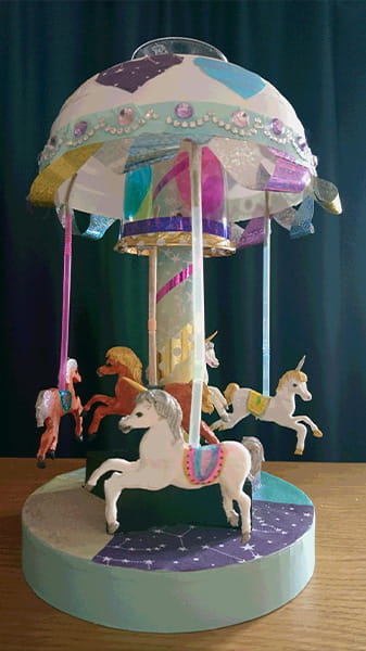 かわいらしい色(いろ)づかいがほほえましい作品(さくひん)です。布(ぬの)や木につかえるというボンド 木工用(もっこうよう)の特性(とくせい)を活(い)かしながら、お家(うち)にあるものを材料(ざいりょう)として上手(じょうず)につかって、きちんと動(うご)くように工夫(くふう)しているところも感心(かんしん)しました。ぜひ親子(おやこ)で一緒(いっしょ)にかんらんしゃを動(うご)かしてたのしく遊(あそ)んでください。