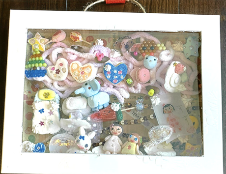 貼(は)っている作品(さくひん)のひとつひとつがかわいいです。全体(ぜんたい)のバランスもいいですね。紙粘土(かみねんど)への着色(ちゃくしょく)や飾(かざ)りつけも素敵(すてき)です。