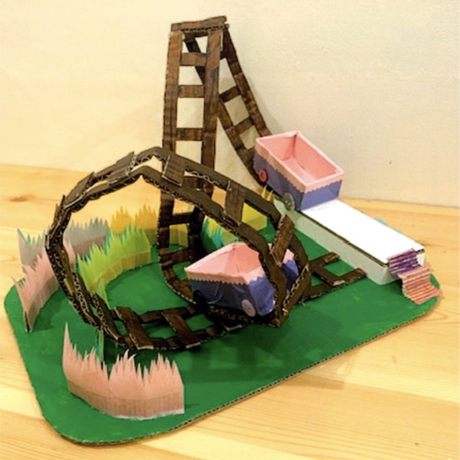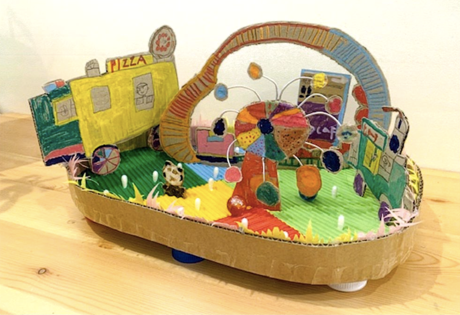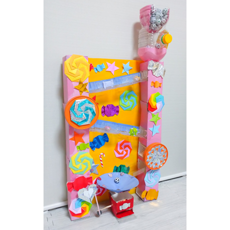 作品全体(さくひんぜんたい)の配色(はいしょく)がカラフルでかわいいです。観覧車(かんらんしゃ)も見事(みごと)ですが、それを囲(かこ)っている飾(かざ)り付(つ)けの作(つく)り物(もの)もいいですね。全体(ぜんたい)のバランスも私好(わたしごの)みの作品(さくひん)です。