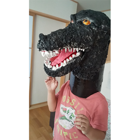 すごい! の一言(ひとこと)。私(わたし)も被(かぶ)ってみたい作品(さくひん)です。怪獣(かいじゅう)の目(め)つきや色(いろ)もリアルに表現(ひょうげん)されています。怪獣(かいじゅう)の皮膚(ひふ)の表現(ひょうげん)も見事(みごと)ですね。皮膚(ひふ)の凹凸(おうとつ)を作(つく)るのは大変(たいへん)だったと想像(そうぞう)できます。