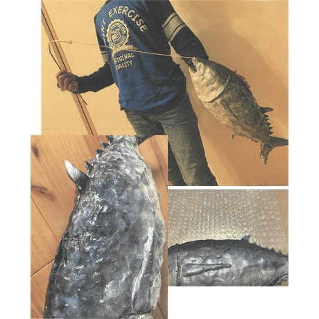 本物(ほんもの)のマグロと見(み)まごうばかりの作品(さくひん)に感動(かんどう)しました。とにかく、ギラギラのウロコが見事(みごと)の一言(ひとこと)です。私(わたし)もマグロが大好(だいす)きです、食(た)べるのが(笑)